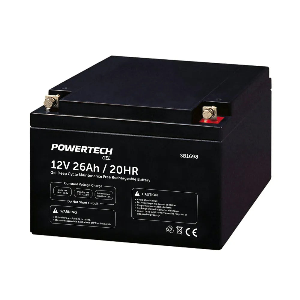 High quality deep-cycle gel sealed lead acid batteries are excellent for high capacity versatile storage. As with all gel cells, this 26Ah battery can be operated and charged in any position, are leakproof and completely sealed. Gel batteries are ideal for solar power, camping, 4WD, auxiliary applications and anywhere deep discharge and recovery is required.