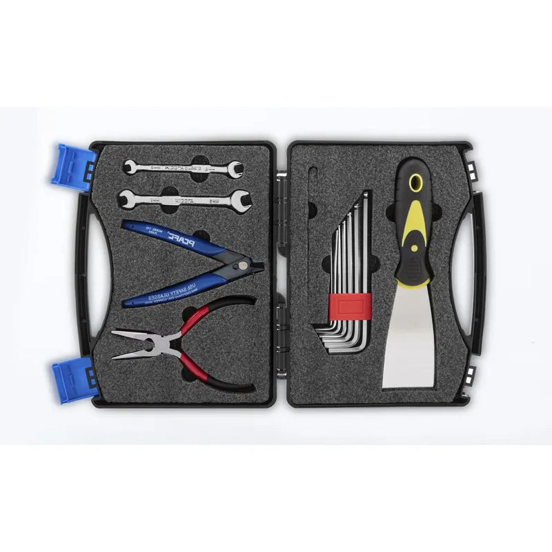 Includes spatula, 7 Allen key set (1.5, 2, 2.5, 3/4/5/6mm), pliers, side cutter, 6/7mm & 8/9mm spanners.